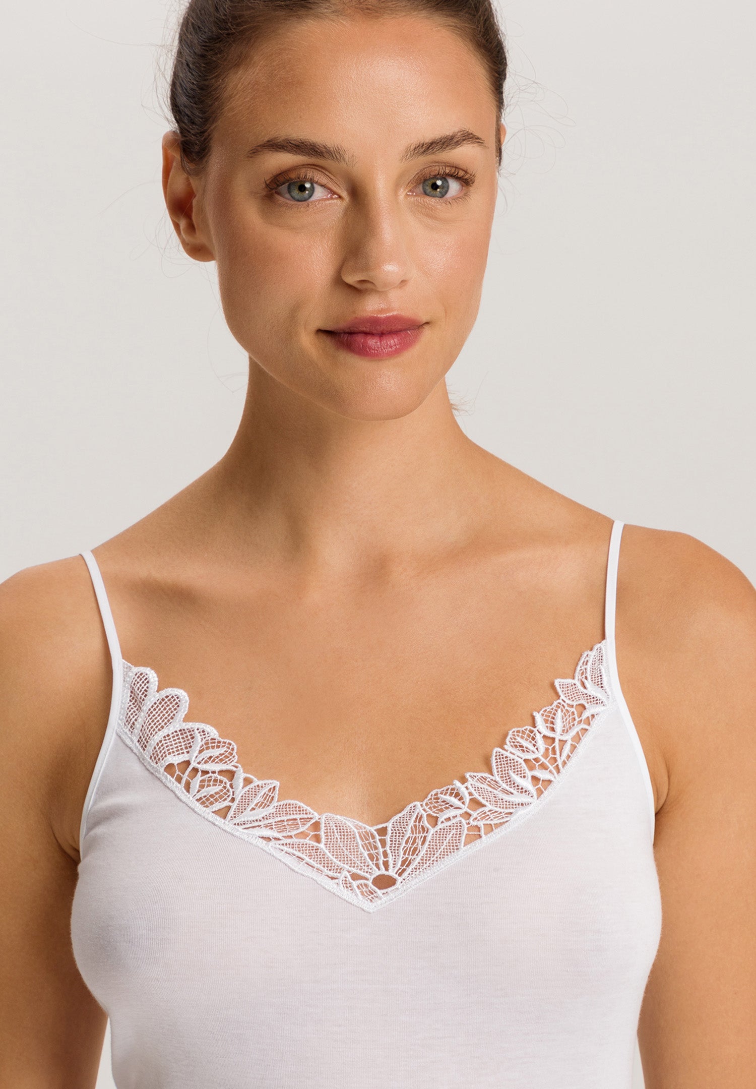 This camisole is perfect on its own, or under blouses with low necklines. Fine flowers and leaves in a V-look entwine delicately at the front of the neckline. This camisole has no hems or side seams and is wonderfully soft on your skin thanks to the mercerized cotton. In this finishing process, the fabric experiences a silky sheen, a higher color brilliance and a longer life than classic cotton.
