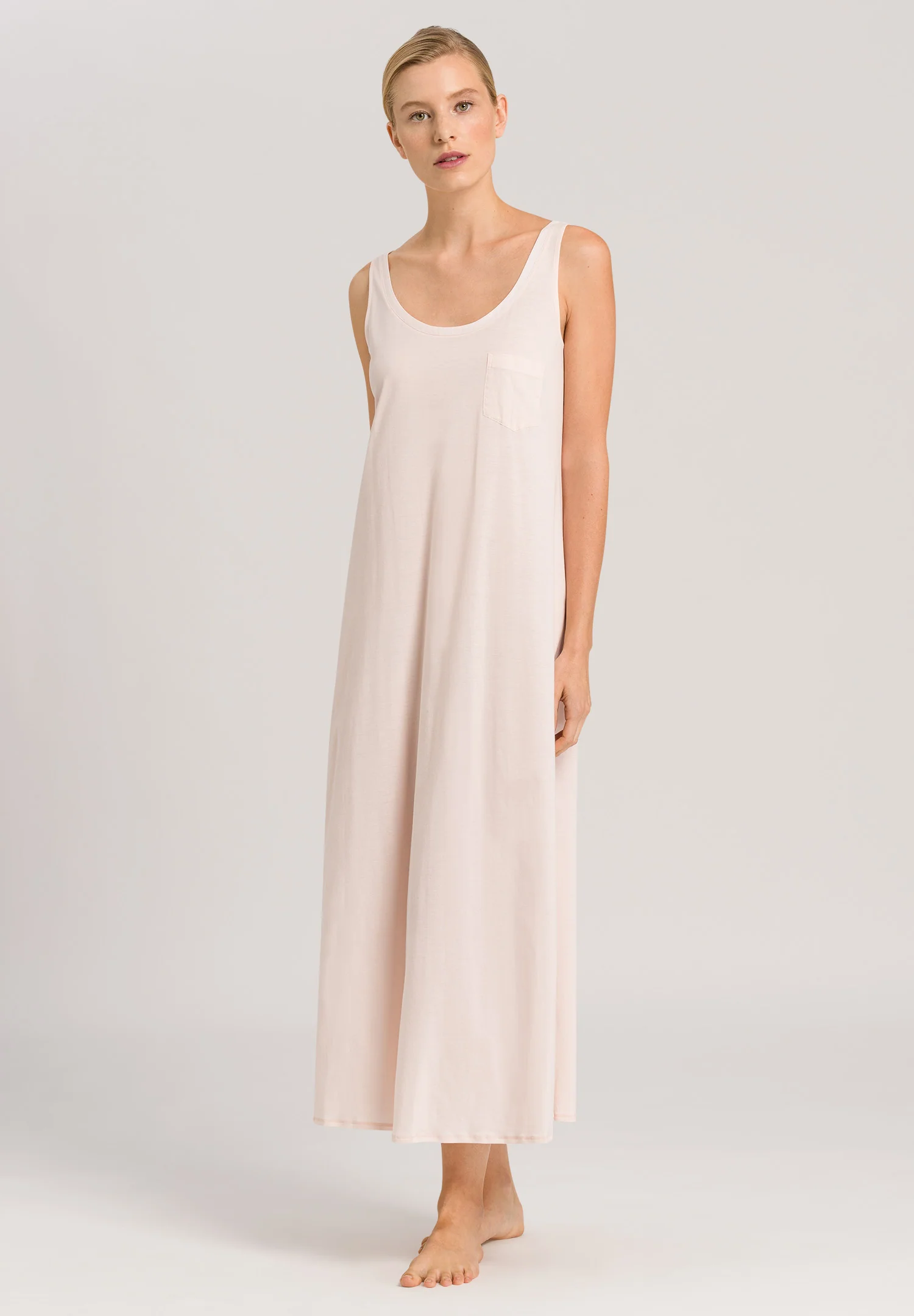 Functional and cleanly-styled, the HANRO Cotton Deluxe Long Tank Gown is tailored from beautifully soft 100% mercerized PIMA cotton, and features subtle design details such as 100% cotton woven voile trim and a practical chest pocket. Falling to the ankle on most, this full-length women’s nightgown has non-adjustable tank straps; for ease-of-wear and effortless versatility whether worn as sleepwear or loungewear.