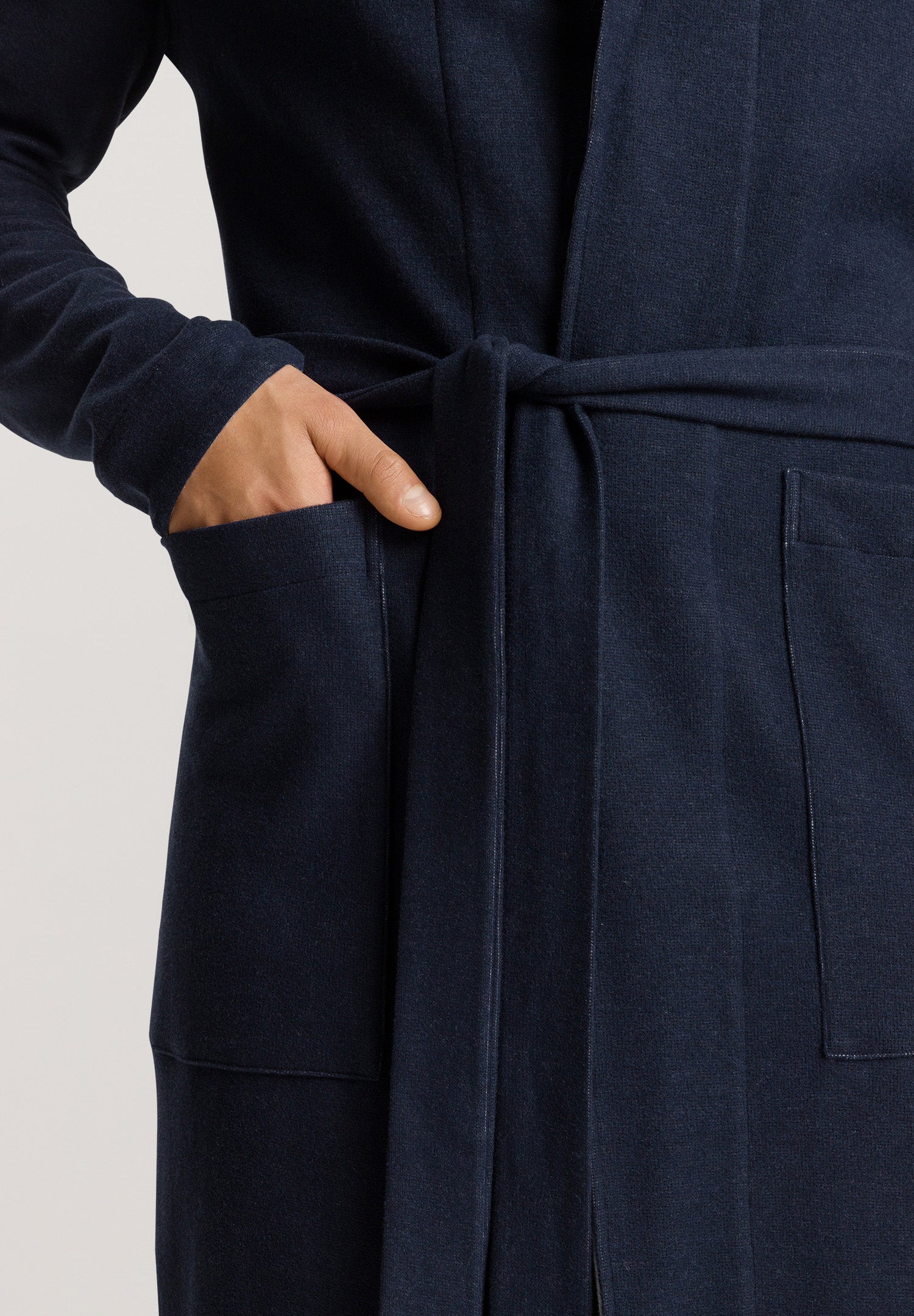 This HANRO robe from the Cozy Living collection is must-have loungewear piece. It is made of soft double-face jersey with cotton from recycled fibers. This provides an ultra-comfortable feel and brings a touch of luxury to your skin. The reversible style is great for relaxing at home and pairs perfectly with styles from the Woolen Silk and Cozy Comfort collections.