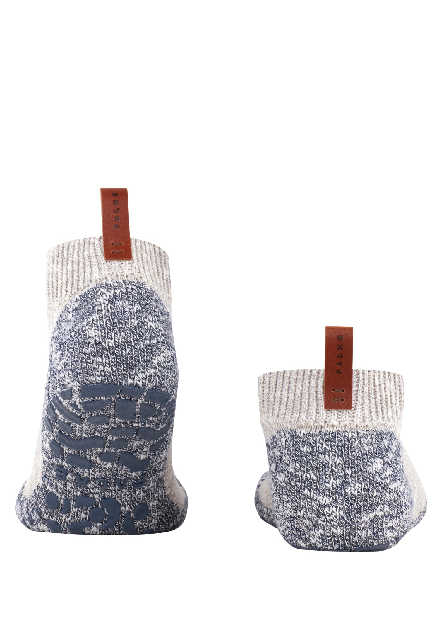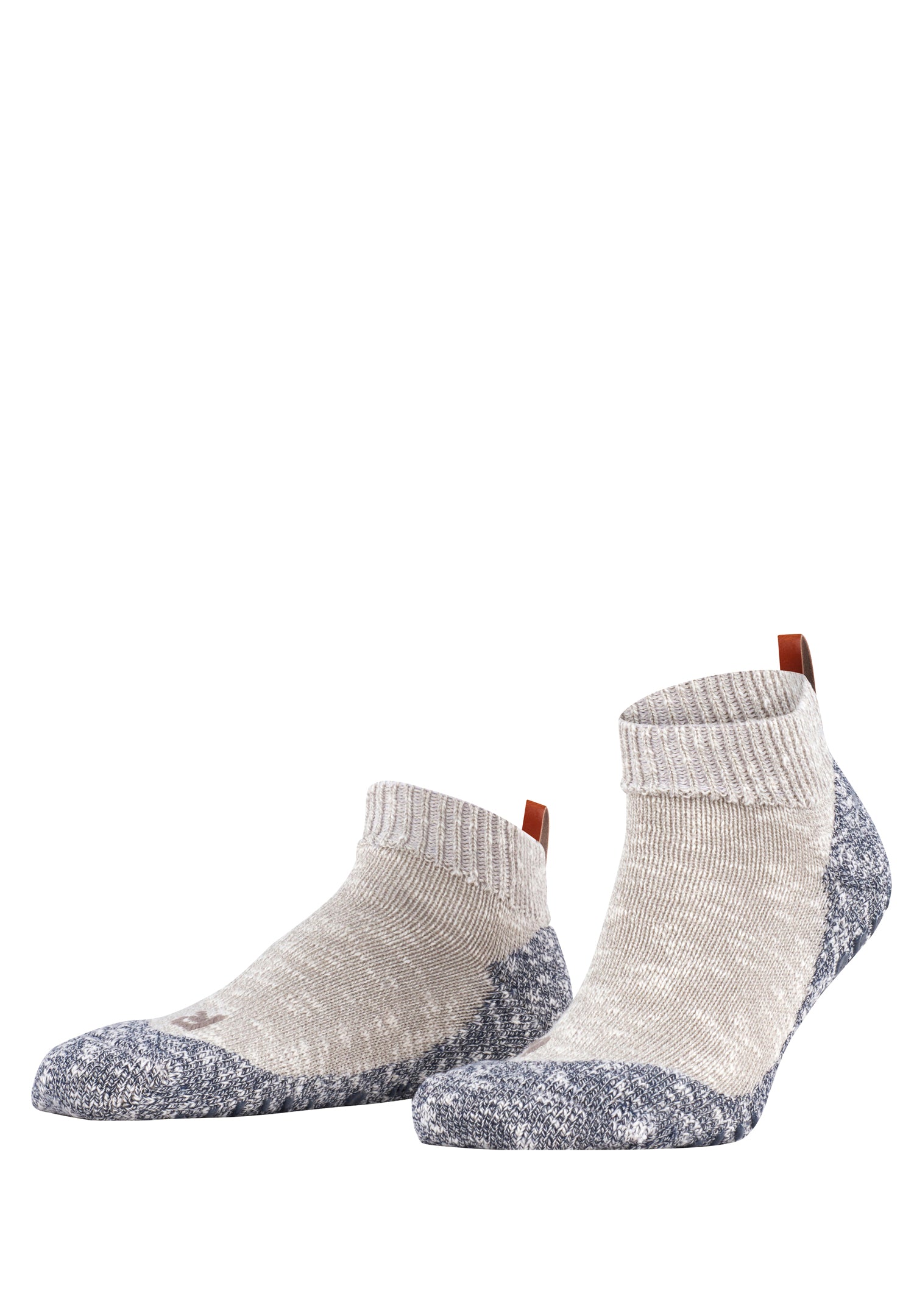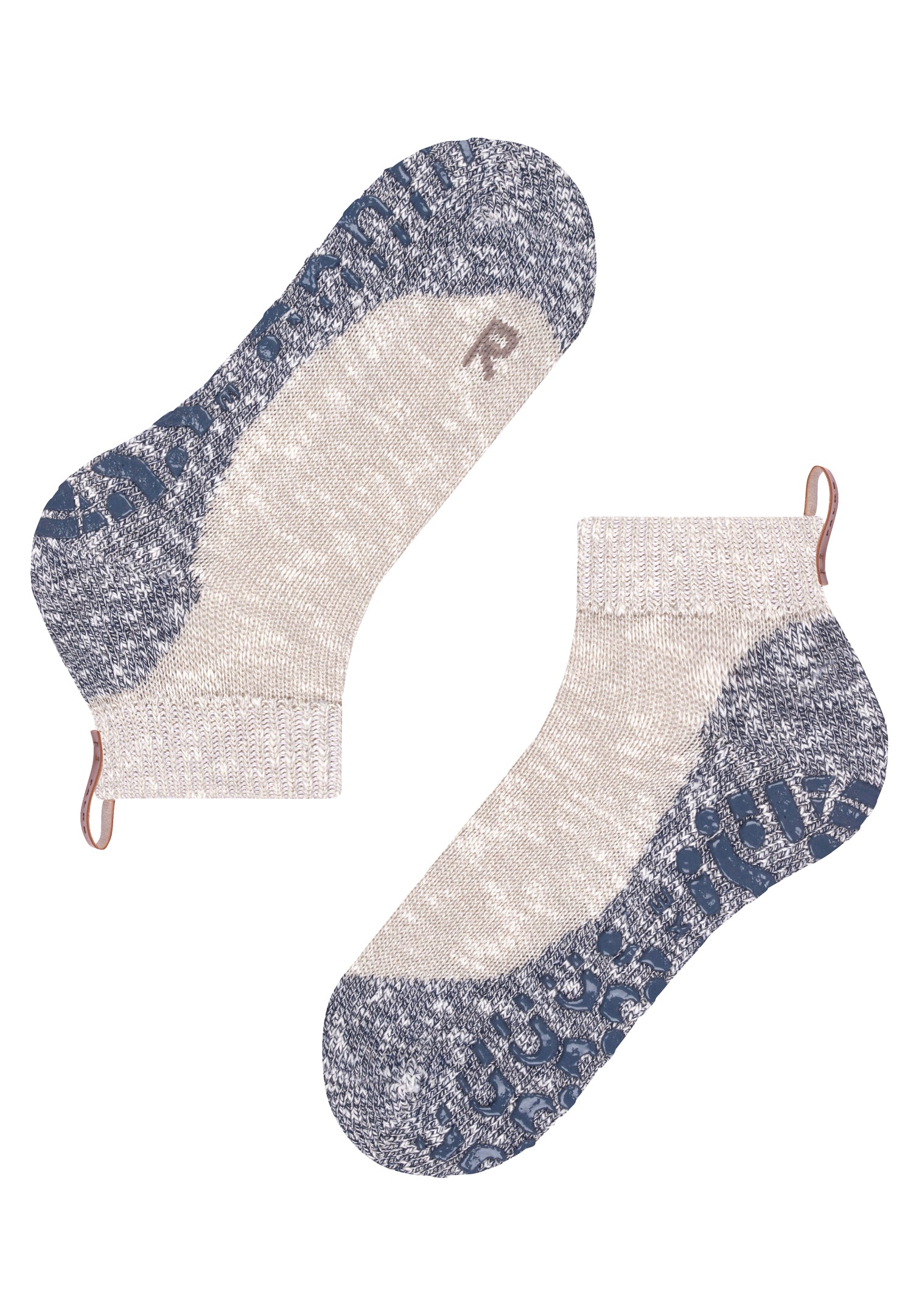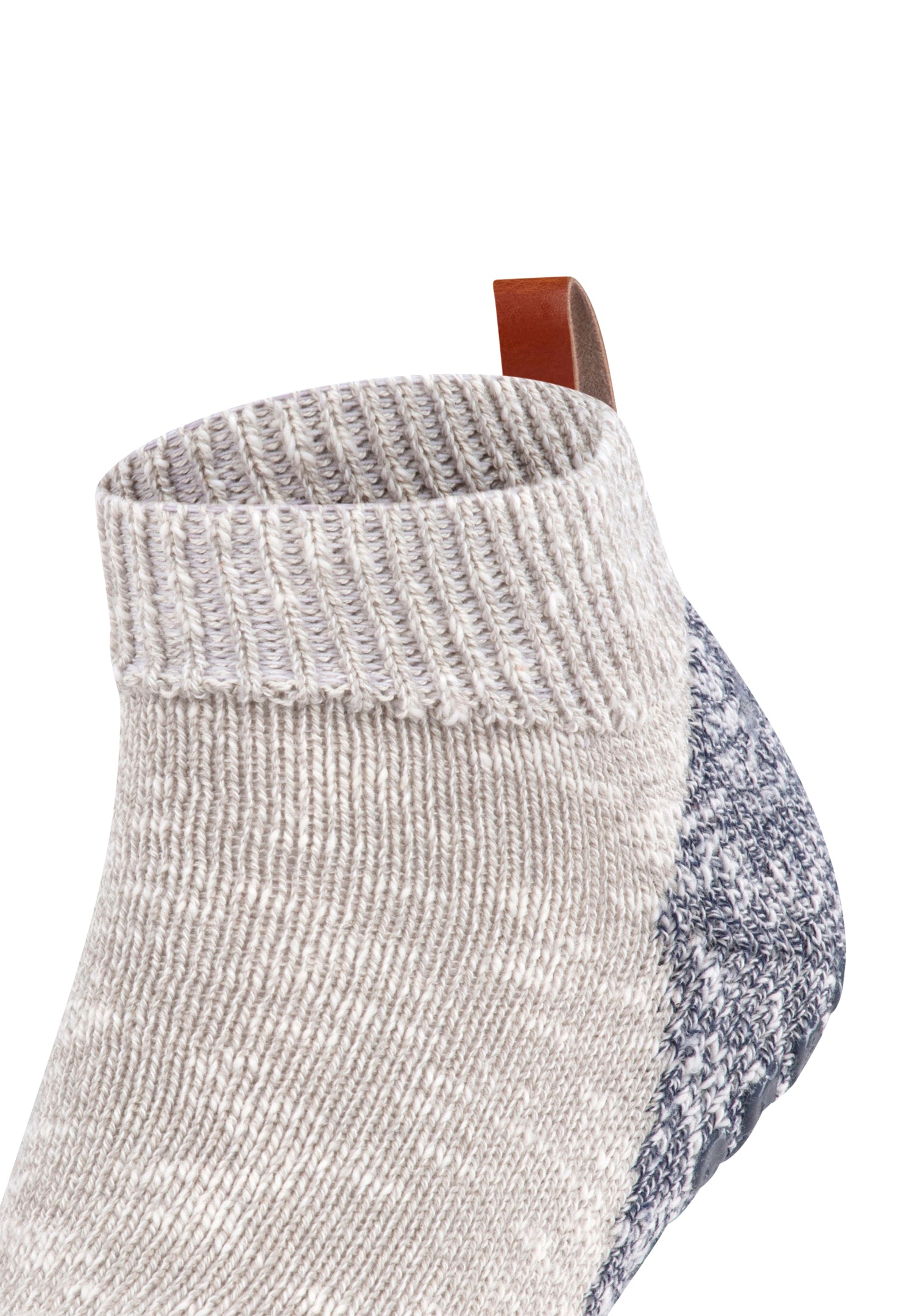 Comfortable house socks for relaxing at home. The printed nubs on the sole ensure an improved grip. Thanks to their ergonomic shape, these sneaker socks fit the foot perfectly. The use of mottled yarn and stitched vegan leather tabs on the heels give the sneaker sock its robust appearance.