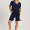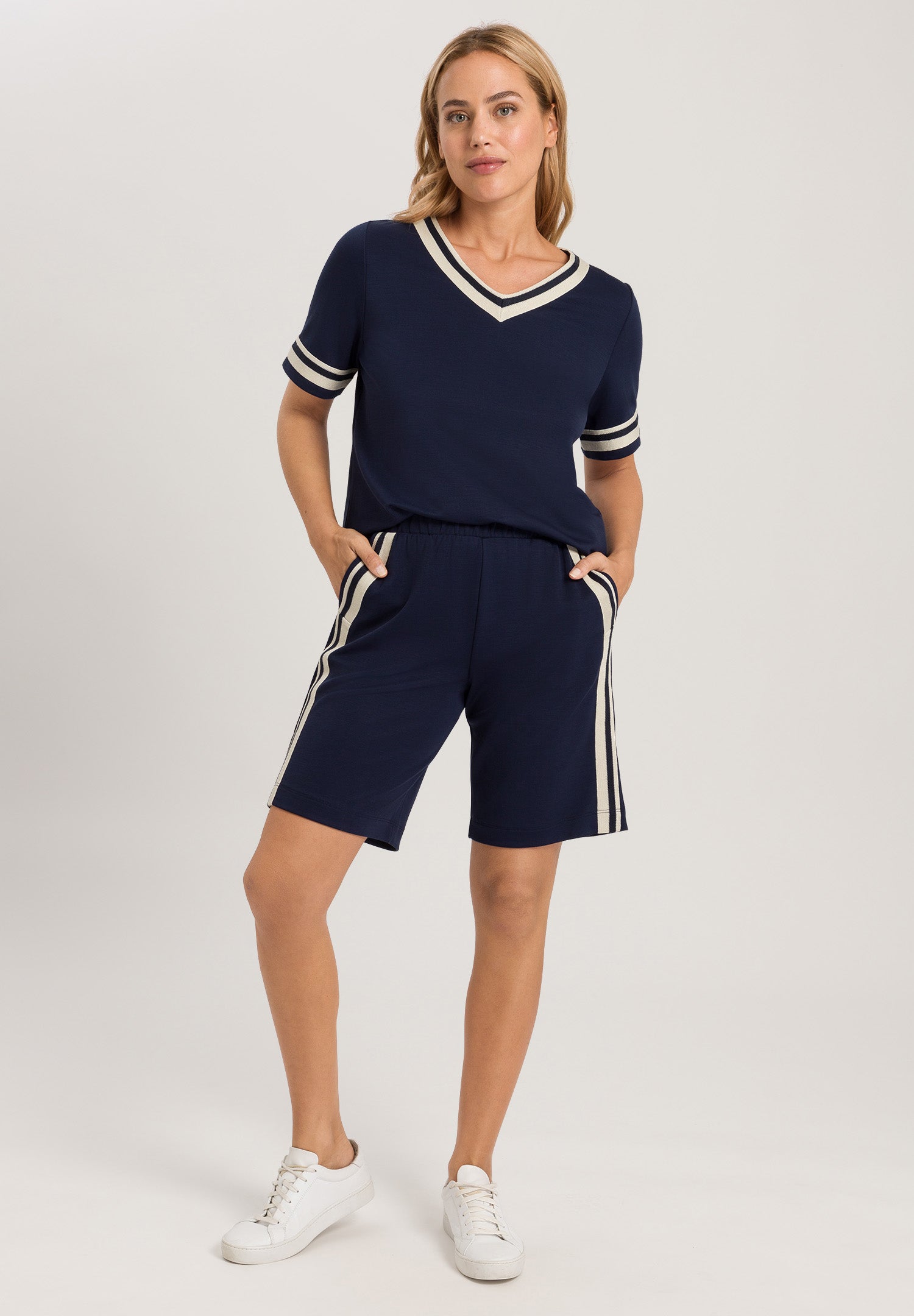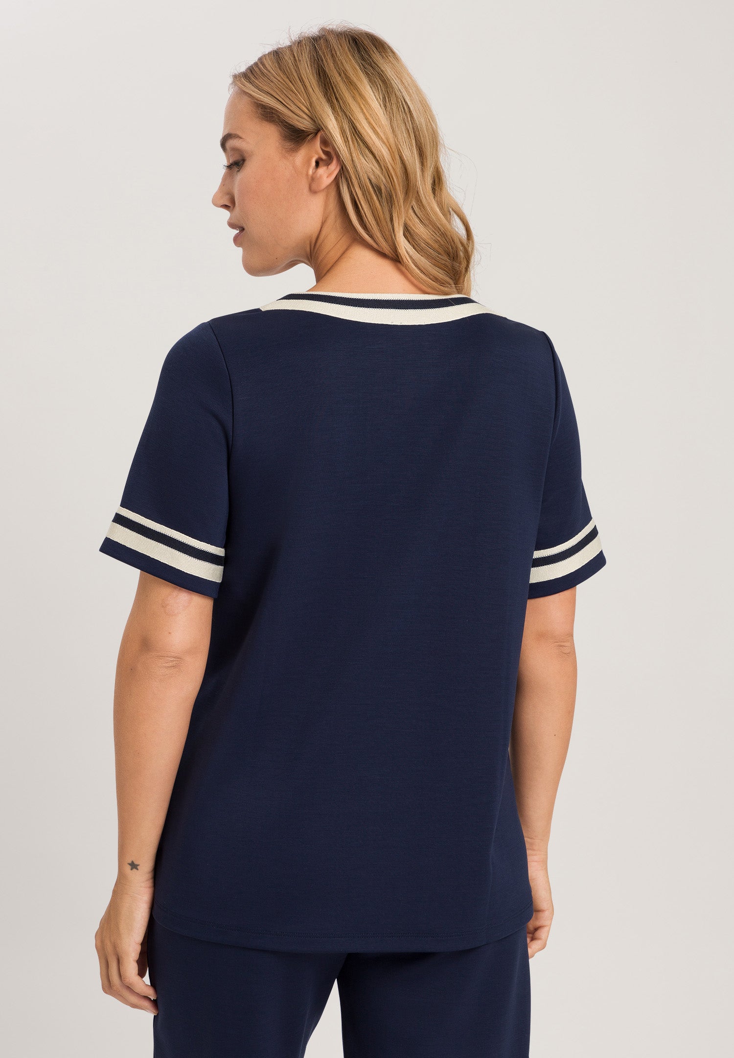 Loungewear made of sustainable, comfortable TENCELâ„¢ is defined by Madeline. It is ideal for travel, a casual office day or at home. The wearing options are endless. It boasts fashionable color block ribbon stripe details and is inspired by fashion-defining HANRO styles of the 30s. The short sleeve shirt with its stripe accents makes a fabulous set with a pant in the collection.
