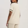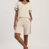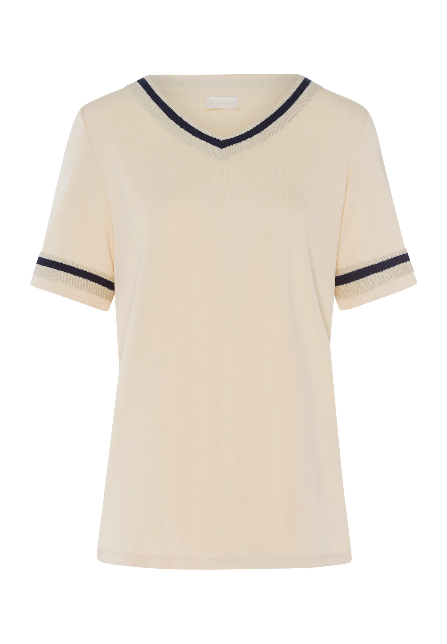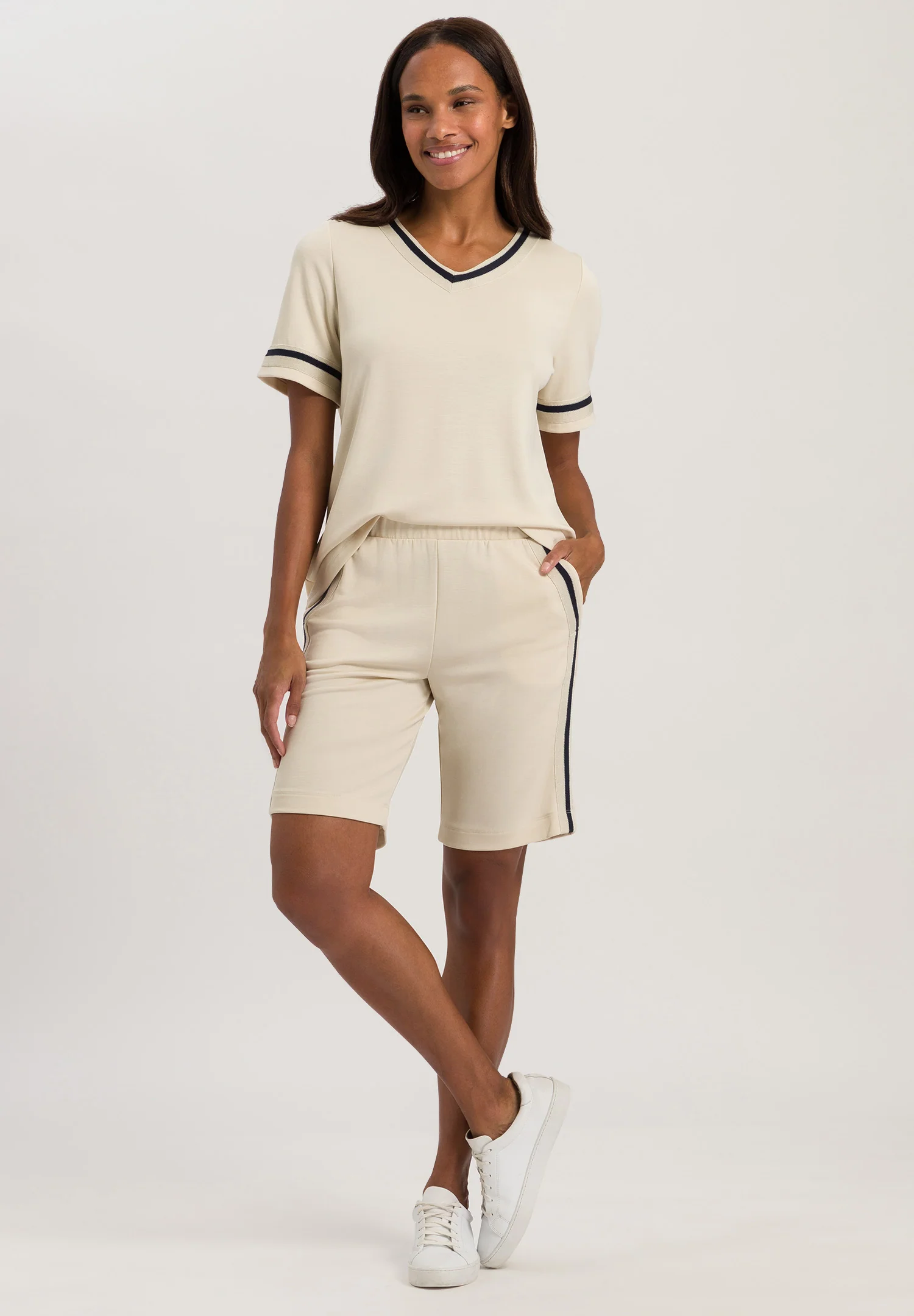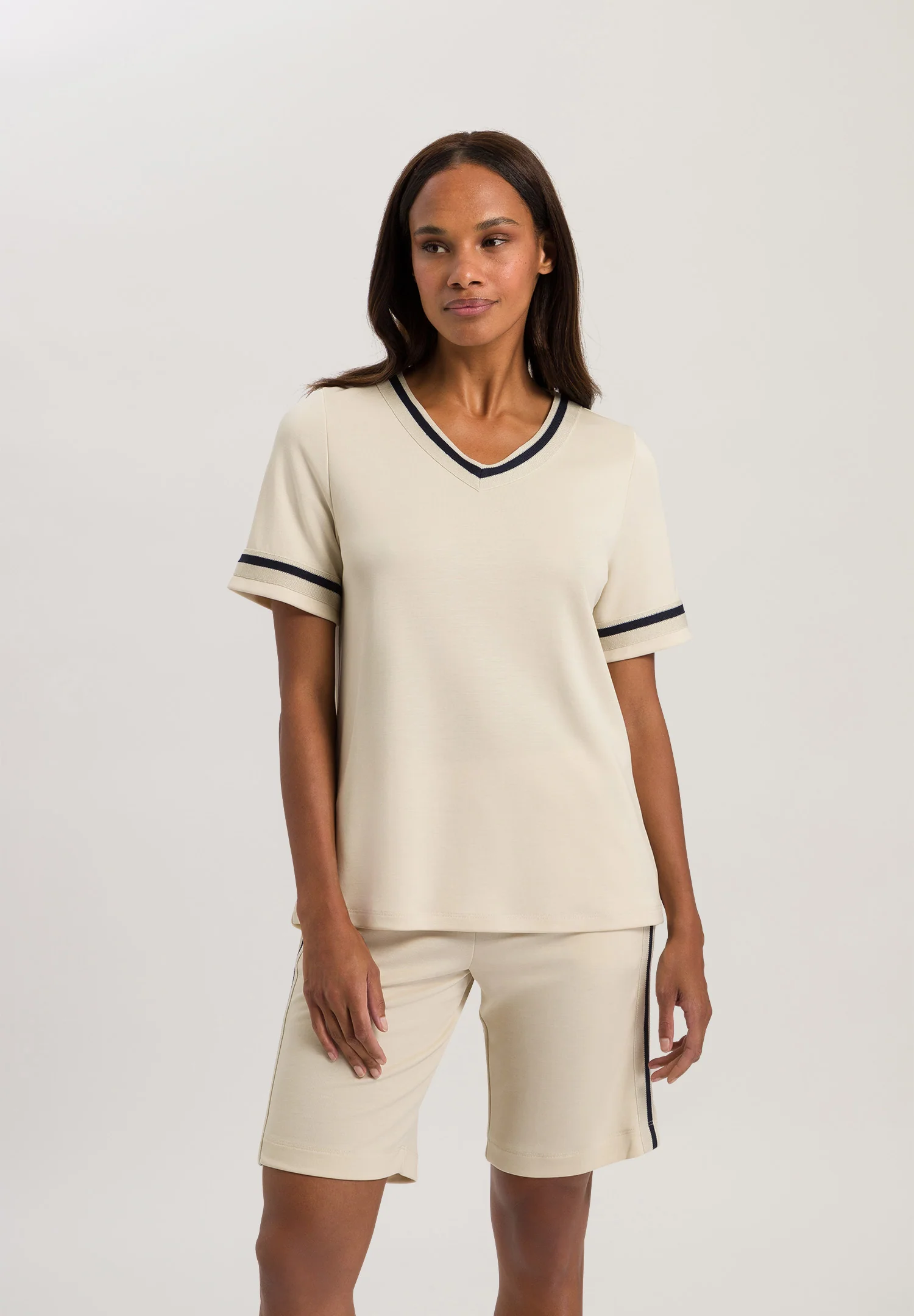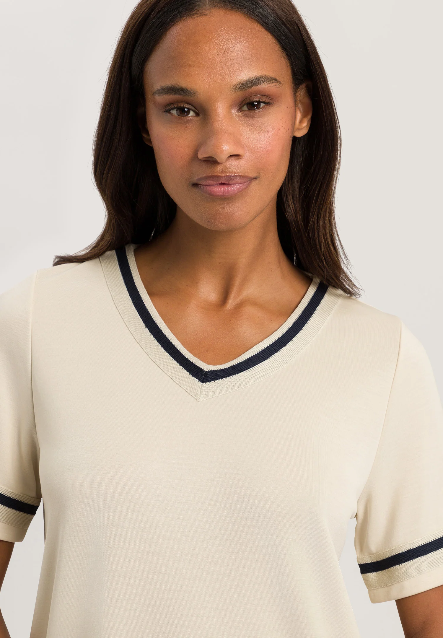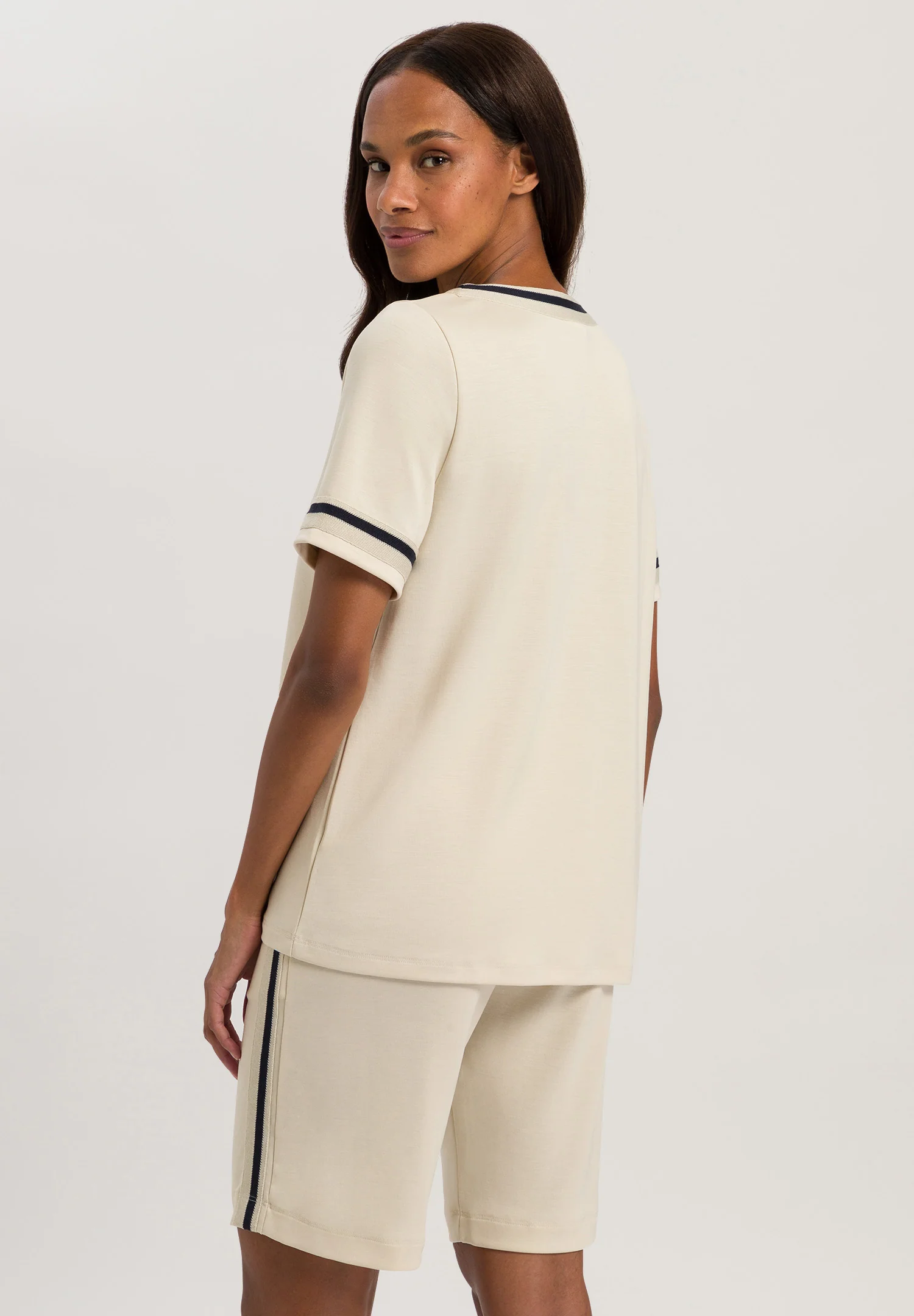 Loungewear made of sustainable, comfortable TENCELâ„¢ is defined by Madeline. It is ideal for travel, a casual office day or at home. The wearing options are endless. It boasts fashionable color block ribbon stripe details and is inspired by fashion-defining HANRO styles of the 30s. The short sleeve shirt with its stripe accents makes a fabulous set with a pant in the collection.