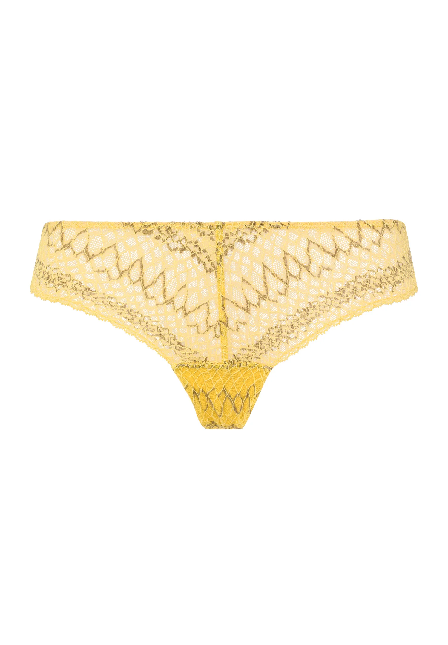 Modern and sensual, the Thalie collection features classic lingerie styles in a contemporary monochrome snake print lace. This thong features a low rise waist, high cut legs, and minimal back coverage with a cotton gusset. Pair this brief with one of the bras for a stunning set.