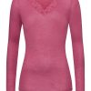 The Woolen 3/4 sleeve shirt is tailored from a soft Merino Wool and silk blend for luxurious warmth and comfort. This finely ribbed shirt is adorned with delicate and flat Jacquardtronic ribbon lace around the V-neck and sleeves. Besides wearing for warmth, this shirt is perfect for layering or to sleep. It pairs beautifully with the Woolen Lace boyleg or legging for the perfect set.